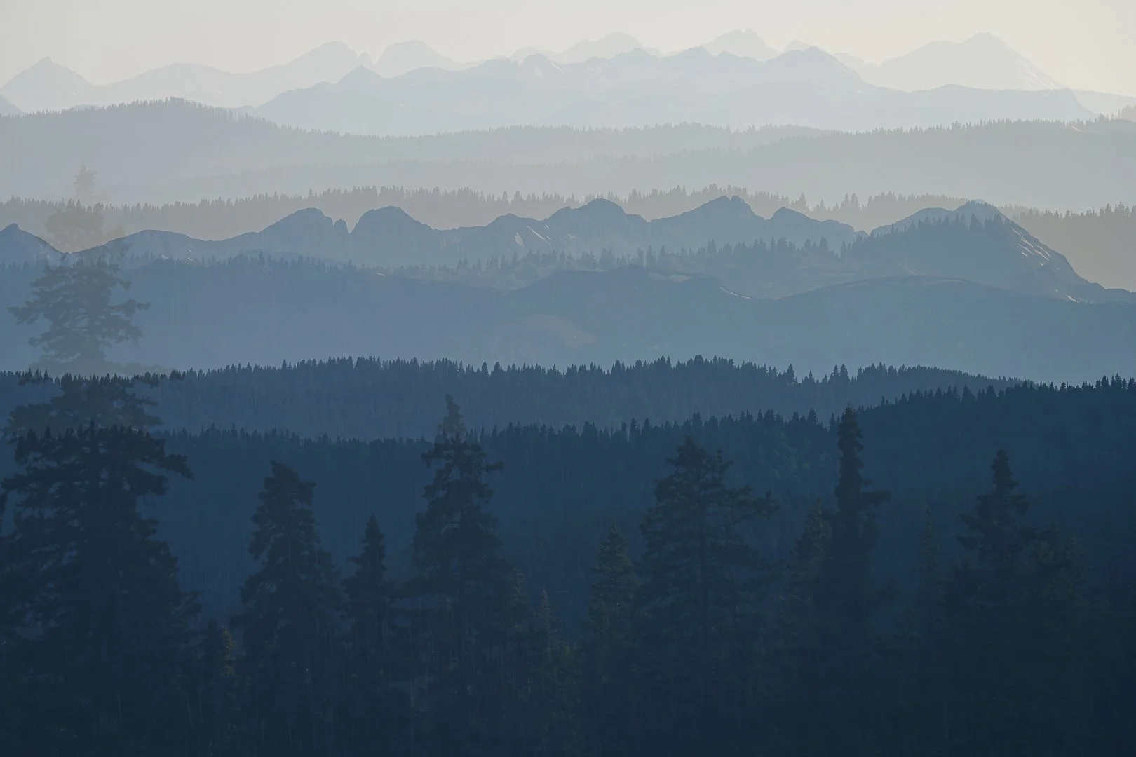 “Summit Assembly” It’s easy to get wrapped up in chasing seasons and the prospect of perfect weather or light. That mindset can hold you back and lesson your opportunity to create work. This photograph was made in the late afternoon when not much was happening in the sky. There was no beautiful sunset, blast of color, or awe-inspiring clouds. What drew me to this scene was the repeated layers in the distance and the pine trees in the foreground. It was perfectly suited for creating a photograph using a multiple exposure technique using three images at different focal lengths to mimic and accentuate the layers.