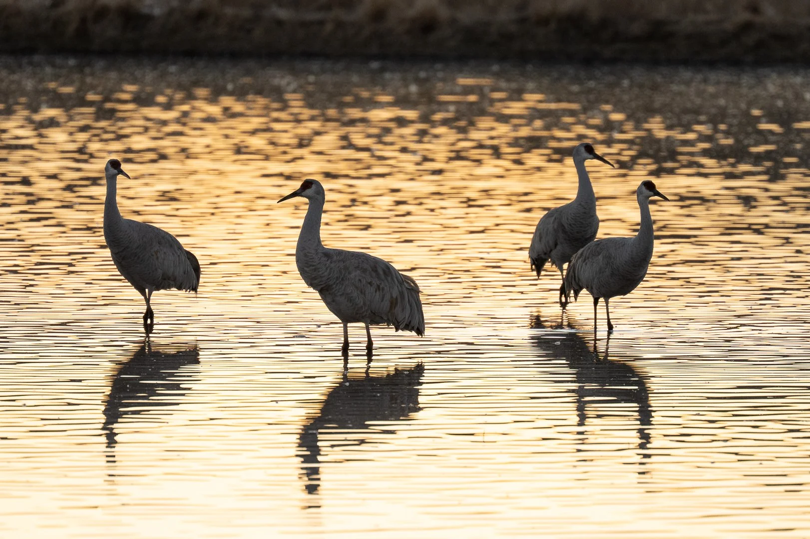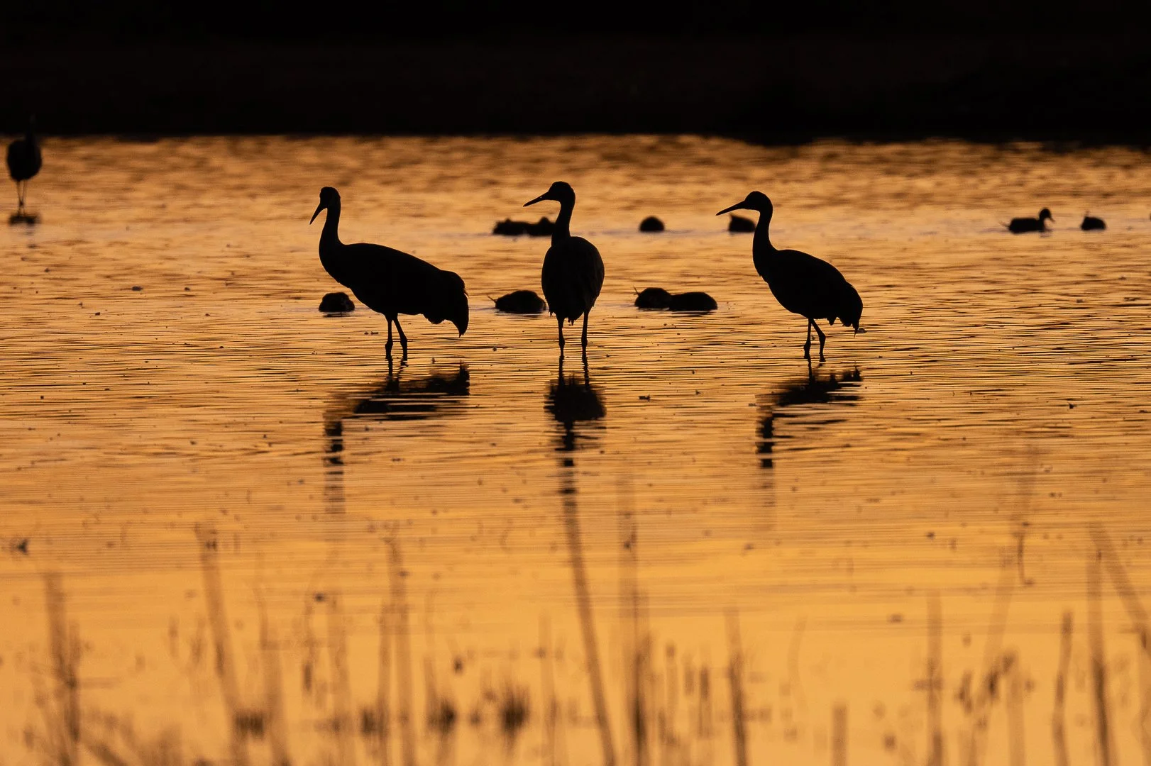 There were a few Sandhill Cranes rummaging around in some of the ponds during the day, but it’s right about sunset when the magic happens. A majority of the cranes start to come in for the evening from foraging for food during the day. They arrive from the north, land in the middle of the pond, and wander around chattering like a social gathering. The bright evening sun behind them lit up the silhouettes of their little bodies as it reflected off the water.