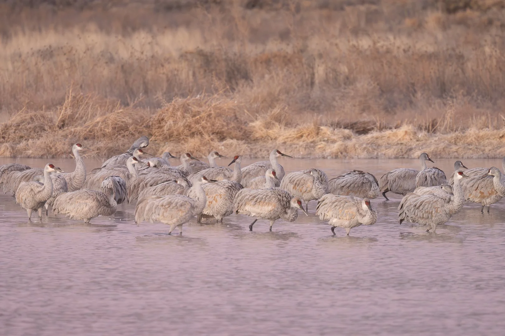 The next morning when we arrived before sunrise, it was a chilly 20 degrees. The bushes that surrounded the pond were frosty and a slight mist was rolling off of the water due to the temperature difference. As the light started to touch the land, we could see the cranes in the middle of the pond. Their bodies were still as the ducks moved around them looking for food. We learned the cranes choose bodies of water that are a particular depth so they can stand in it overnight with their bodies hovering just over the top of the water.