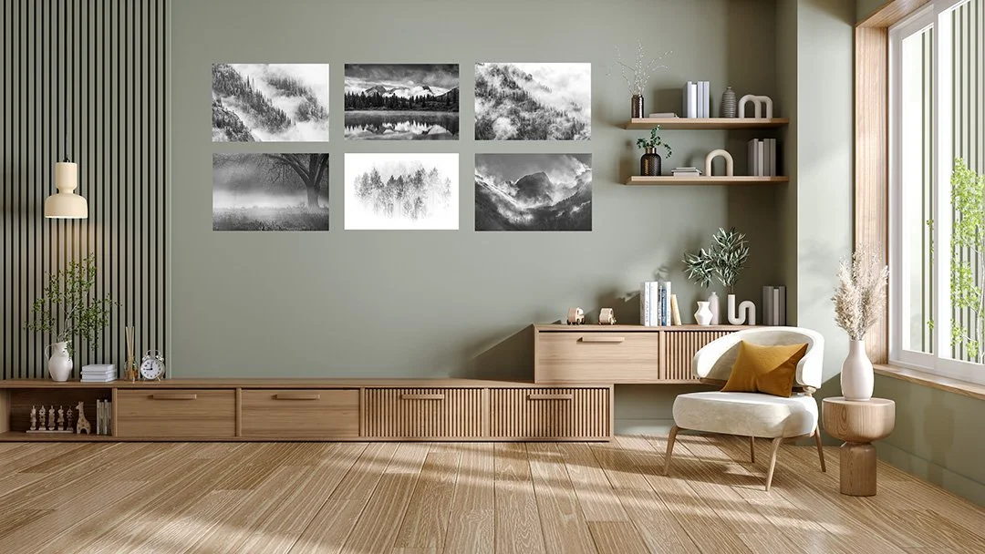 Miniseries artwork brings cohesion and flow to a space, telling a story across multiple pieces rather than relying on a single focal point. Create a space with interest and diversity while maintaining a sense of unity.